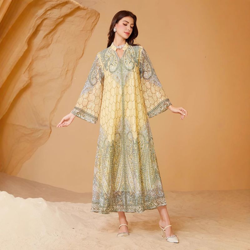 241101 Muslim Women's Clothing Long Robe Embroidered Fabric Print Rhinestone Women's Long Dress Abaya