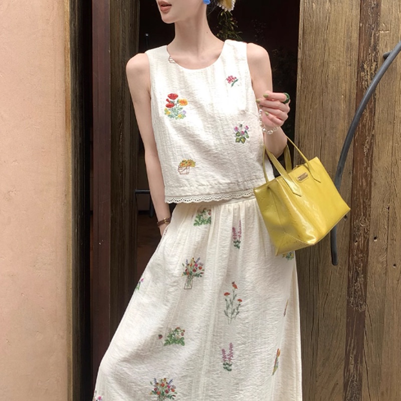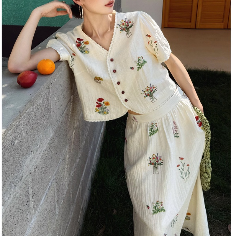 ChicShe ChicShe ChicShe 2025 Nowy Shishiyou Lniany T-shirt z haftem i krótkim rękawem Letni leniwy zestaw spódniczek w stylu pół spódnicy damski