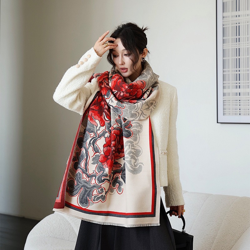 Peony scarf for women in winter, Chinese style double-sided jacquard shawl, warm and thick outer layer, photo and outfit to give to elders and mothers