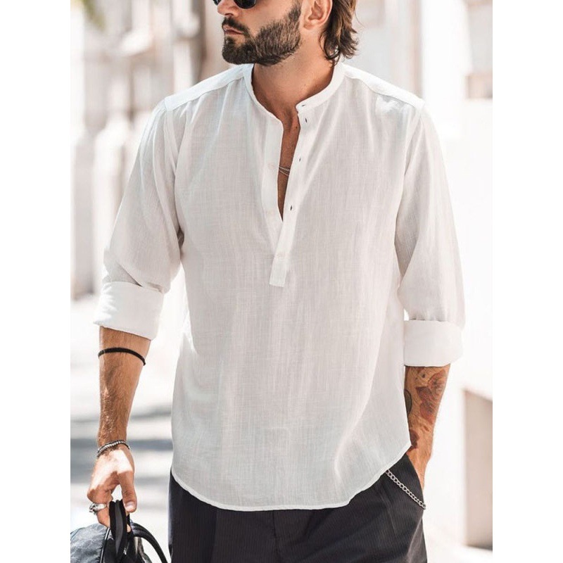 Spring and Autumn style men's casual standing collar, door barrel, solid color long sleeved shirt, bamboo knot cotton linen shirt, men's clothing