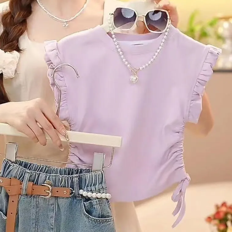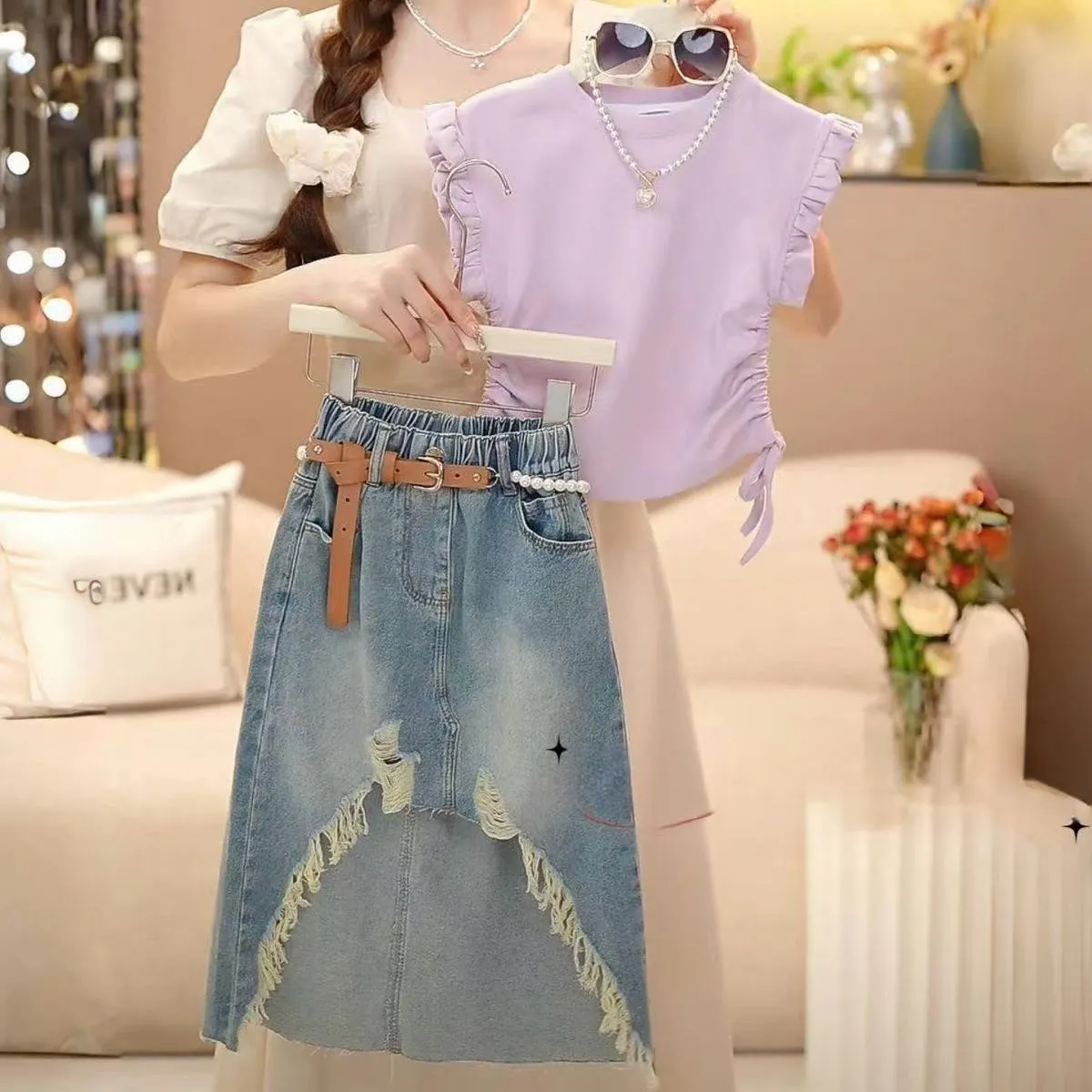 Matka i dzieci Dziewczęta Letnie Garnitury 2024 Nowy Styl Stylowa Dziecięca Spódnica Jeansowa Z Krótkim Rękawem Letnia Spódnica Dziecięca Dwuczęściowy Garnitur Modny