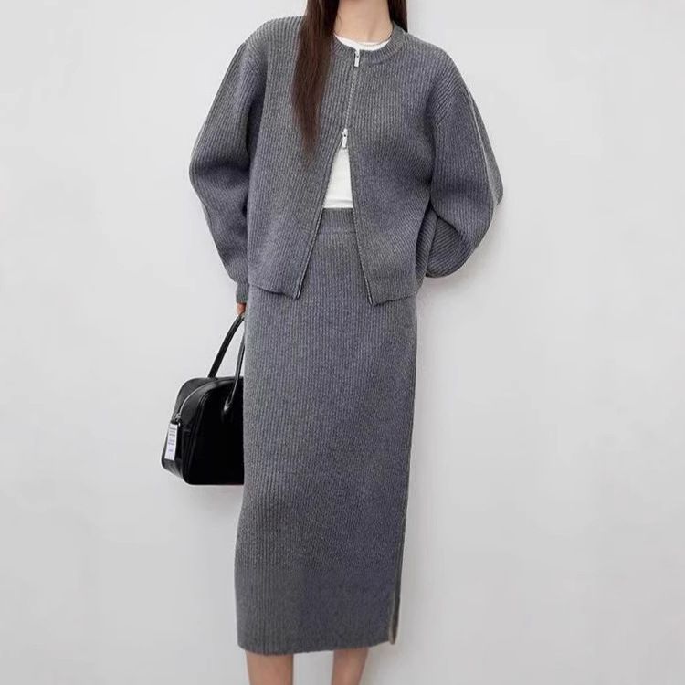 New Round Neck Zipper Knitted Two-piece Set for Women Autumn Winter Korean Style Sweater Elegant Sweater Half Skirt Set for Women