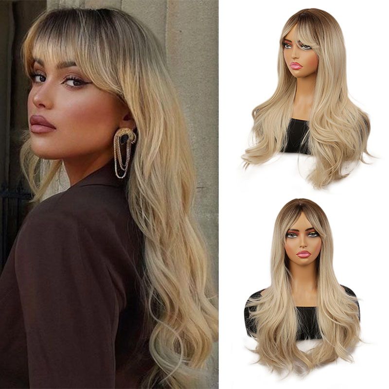 Peruka gradientowa dla kobiet z grzywką duże fale włókno chemiczne długie kręcone włosy nakrycie głowy