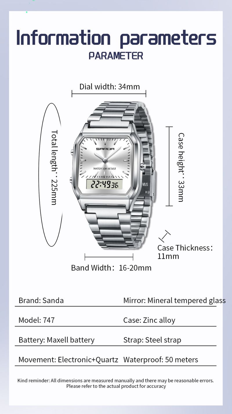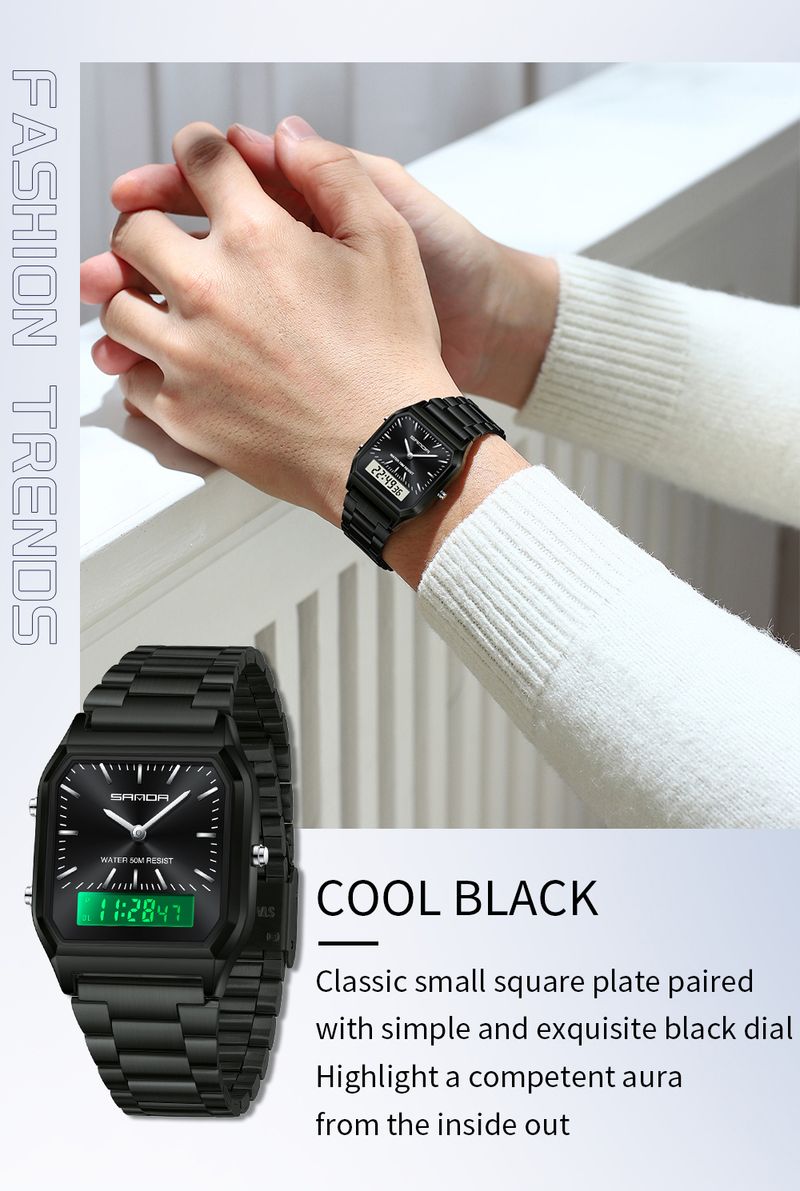 SANDA Dual Display Clock Stal nierdzewna Damski zegarek LED Cyfrowy Unisex Wodoodporny Sportowy Męski Zegarek Kwarcowy
