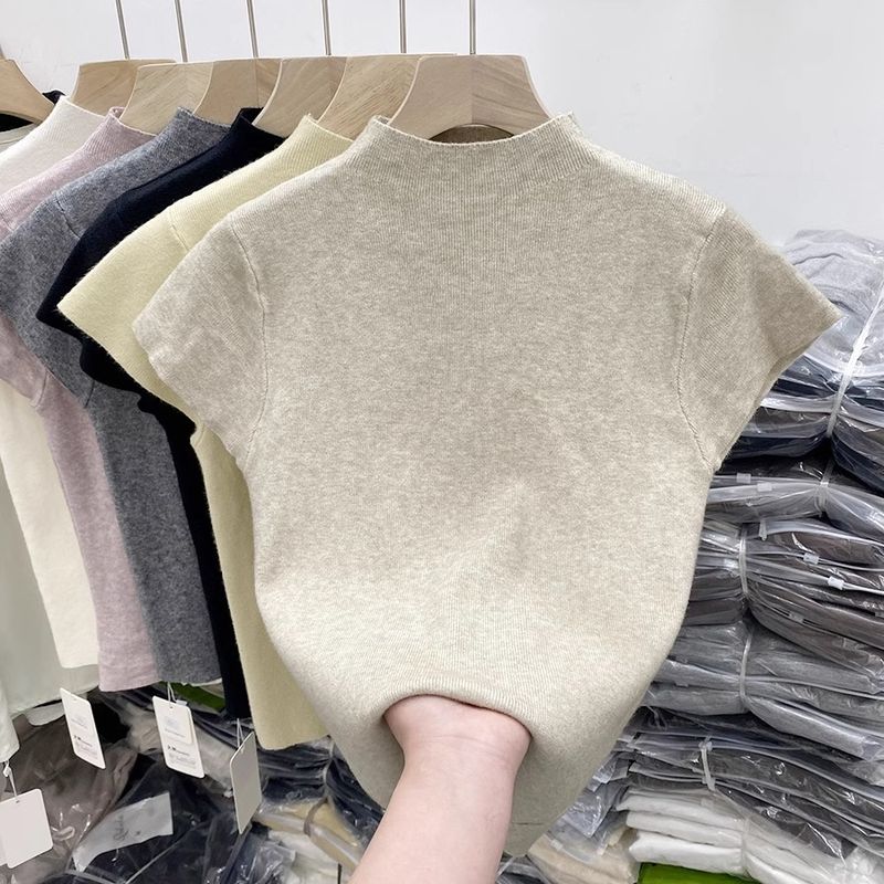 High end summer new style semi high neck temperament knitted sweater for women, slim fit and slimming short sleeved base small shirt thin design